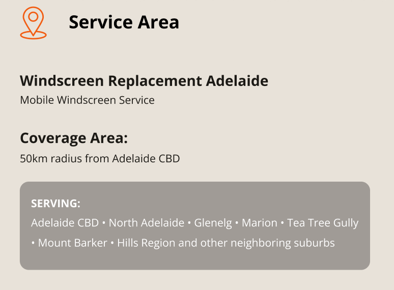 We provide mobile windscreen services across all Adelaide suburbs including CBD, North Adelaide, Glenelg, Marion, Tea Tree Gully, Mount Barker, and surrounding areas within a 50km radius of Adelaide CBD. No extra charge for mobile service.